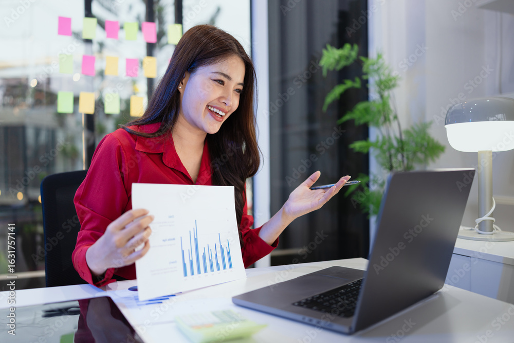 young woman working analysis report on laptop and advisor showing plan. Digital marketing and finance.