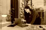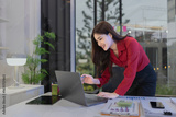 young woman using laptop standing in office.