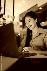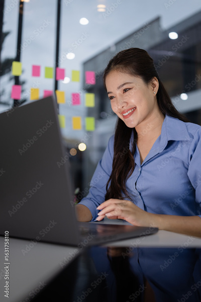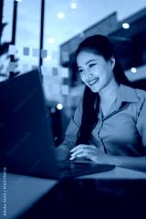 business woman using laptop for working overtime sitting at desk in night office.