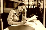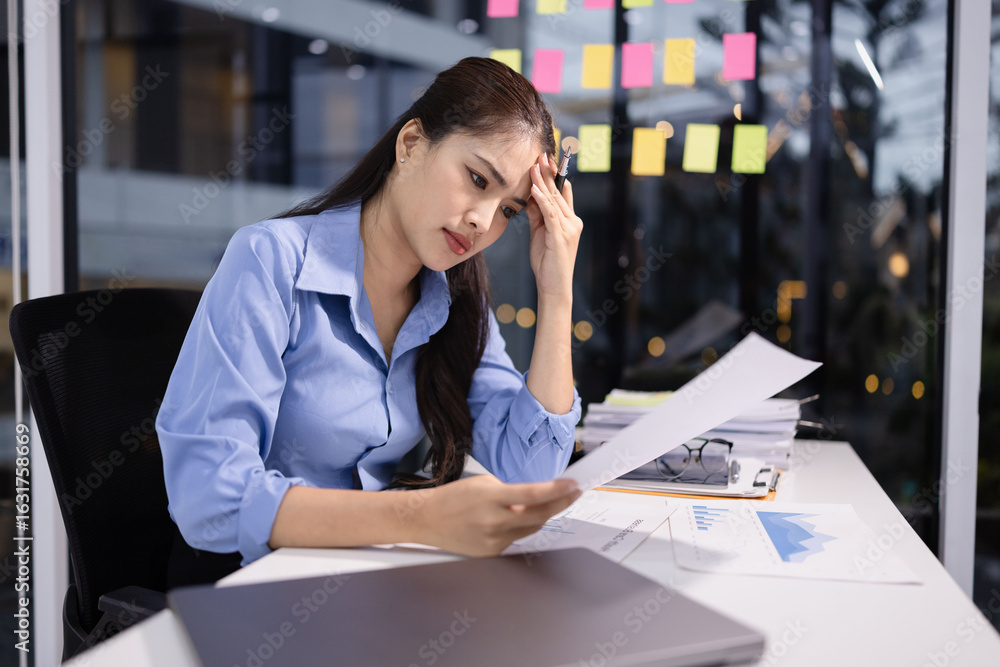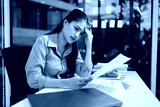 Businesswoman feeling stressed working at desk in office night time.