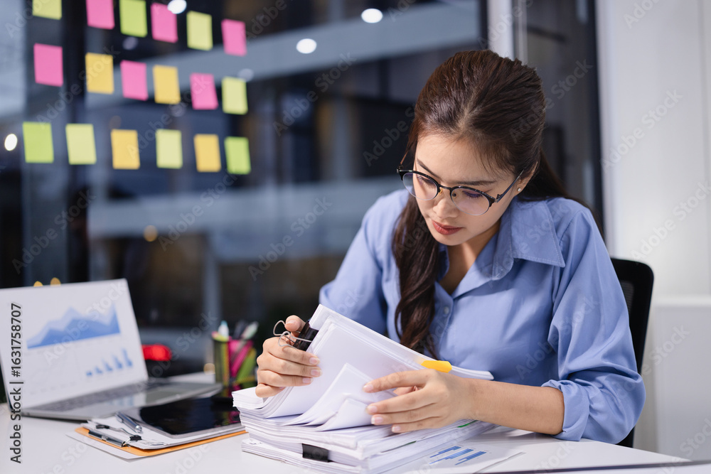 Businesswoman feeling stressed working at desk in office night time.