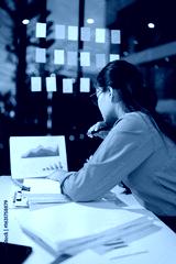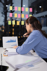 Asian female working on digital laptop with analyzing the financial report from work at night.