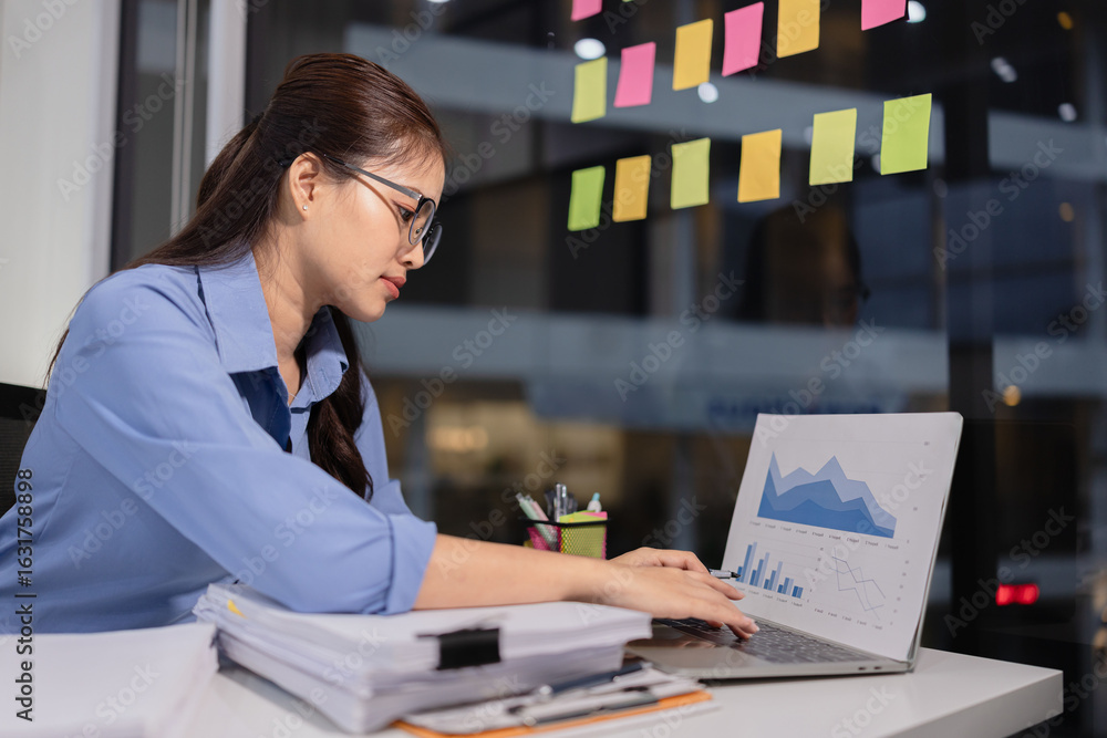 Asian female working on digital laptop with analyzing the financial report from work at night.