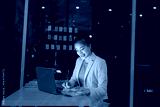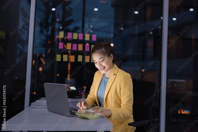 Asian female working on digital laptop with analyzing the financial report from work at night.