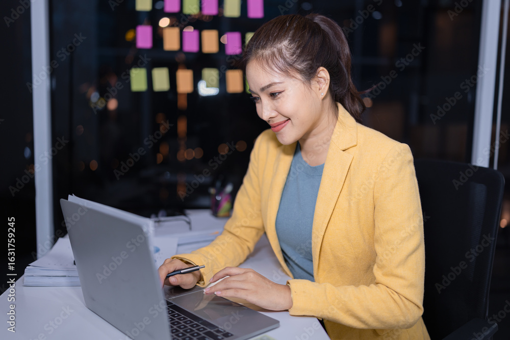 Asian female working on digital laptop with analyzing the financial report from work at night.
