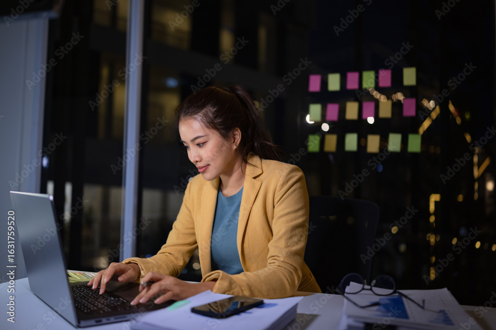 Asian female working on digital laptop with analyzing the financial report from work at night.