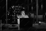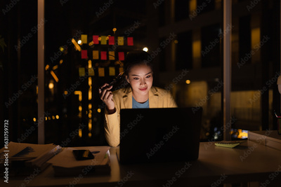 Asian female working on digital laptop with analyzing the financial report from work at night.