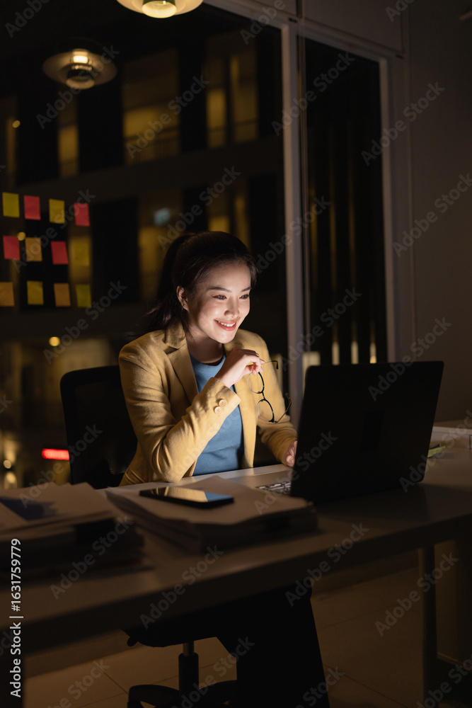 Asian female working on digital laptop with analyzing the financial report from work at night.
