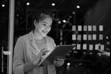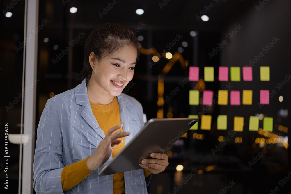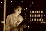 Asian female standing in office and using digital tablet at night.