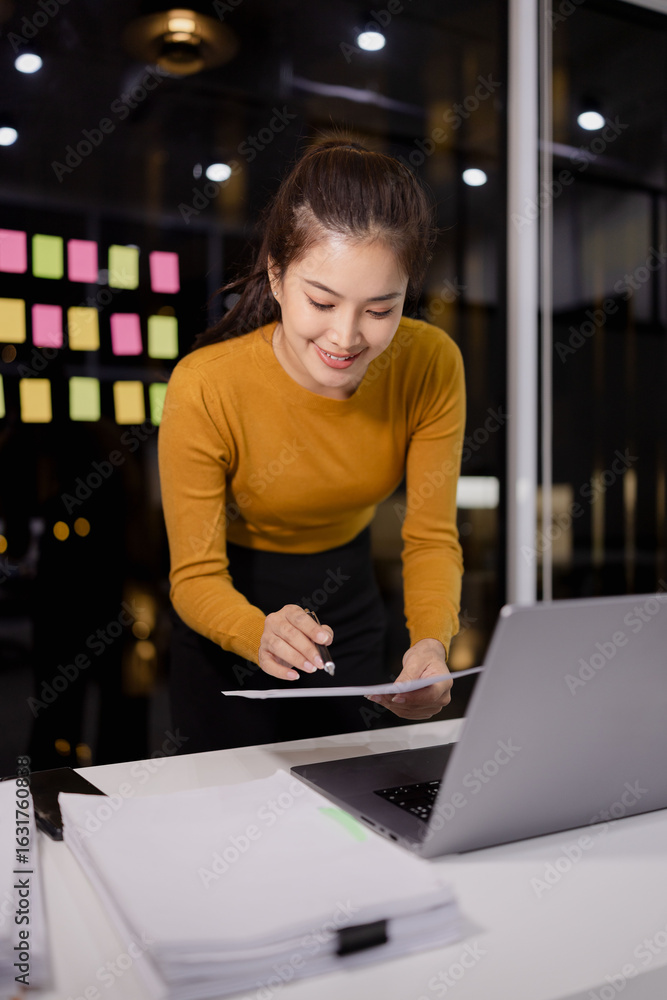 Asian female working on digital laptop with analyzing the financial report from work at night.