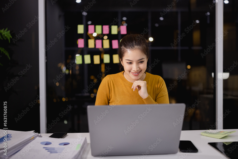 Asian female working on digital laptop from work at night.