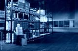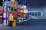 Man is engaged in warehouse business. Modern storage area. Guy with boxes in warehouse building. Man puts boxes on pallet rack. Guy works in warehouse industry. Fulfillment center inside