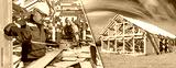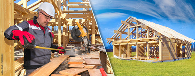 Man builder with tape measure in hands. Construction of wooden house. Man builder worker in gray uniform. Frame of wooden house under blue sky. Construction of frame building. Erection of real estate