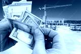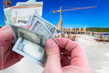 Hands holding international currency in front of active construction site, representing investment, building costs, and global finance. Construction, Finance, Investment, Real Estate.