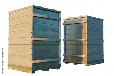 Protective wooden tare. Storage vertical containers. Pallets with cargo protected by plywood. Wooden containers with pallets isolated on white. Shipping containers with base for pallet jack. 3d image