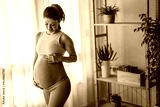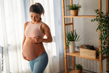 Portrait of young pregnant woman holding hands on her belly at modern home. Pregnancy, motherhood