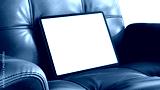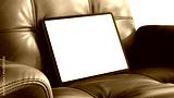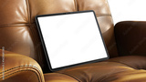 Tablet mockup with transparent screen on a leather chair for web design and App UI presentation. Sunlight with shadows.
