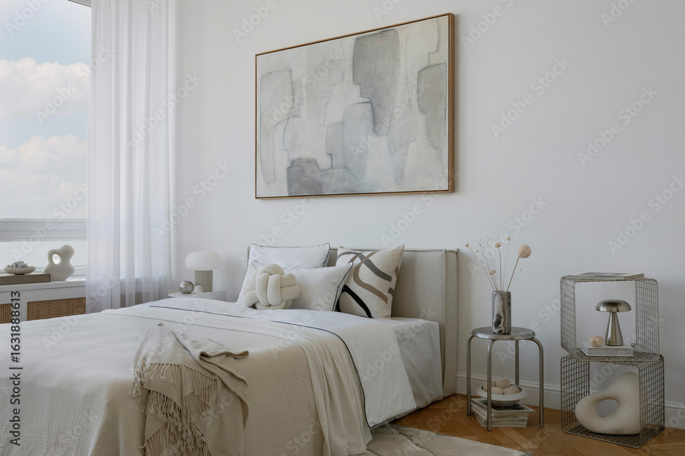 Contemporary bedroom in beige and white tones with mock up abstract wall art, modern lighting and carefully curated accessories.