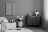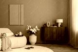Neutral toned living room with soft boucle sofa, sculptural decor, white lilies, mock up art work and a wooden cabinet against a beige wall.