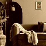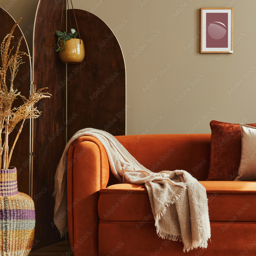 Modern concept of domestic interior with design sofa, wooden room screen, pillow, blanket, picture frame , carpet decor and elegant personal accessories in stylish home decor. Template.