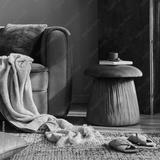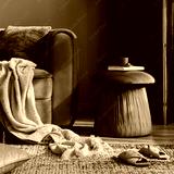 Modern concept of domestic interior with design sofa, wooden room screen, pillow, blanket, picture frame , side fancy pouf and personal accessories in stylish home decor. Template.