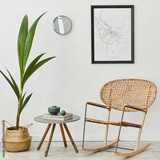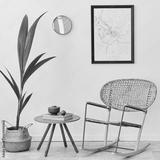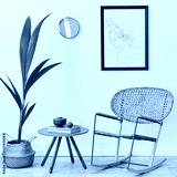 Modern retro concept of home interior with design rattan armchair, coffee table, commode, plants, mock up poster map, decoration and personal accessoreis. Stylish home decor of living room.