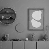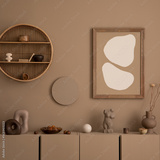 Interior design of cozy living room with mock up poster frame, brown sideboard, vase with dried flowers, round shelf on wall, sculpture and personal accessories. Home decor. Template.