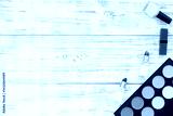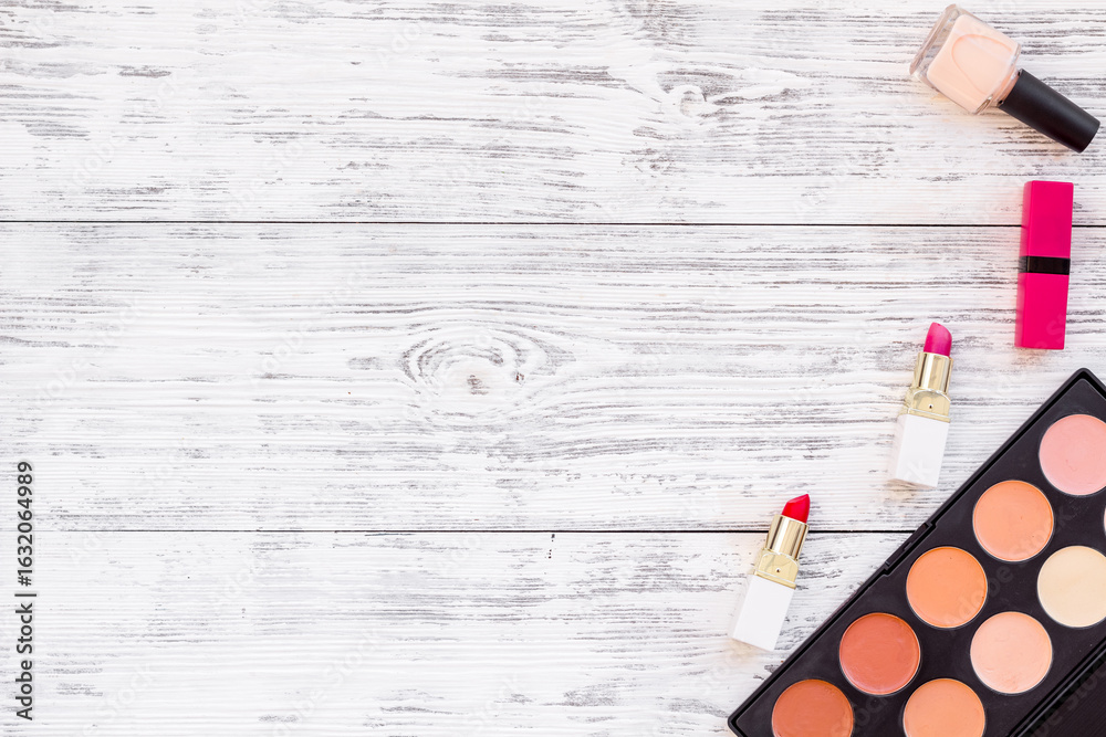 Flatlay of makeup cosmetics on wooden table. Blusher, mascara and lipstick, top view