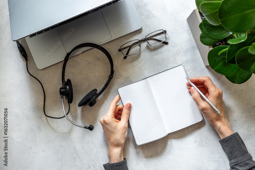 Hands writing in notebook near headset and laptop, top view. Customer support equipment at call center. Online conference. Online education concept