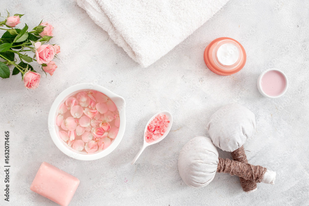 Beauty routine concept. Facial roses essence water and face cream with pink flowers and petals, top view