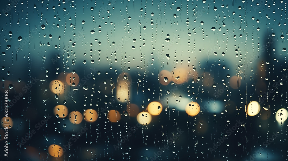 Rain or Dew Droplets on Glass Window with Blurred Background in New York City, Rain Droplets on Glass, Glass Surface Condensation, Blurred background through glass, moody rain window photo