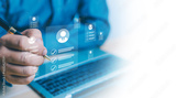 Businessman showing concept of human resources, employees, employment, management, training, HR, technology, business leadership concept, consulting, customer concept, digital service.