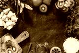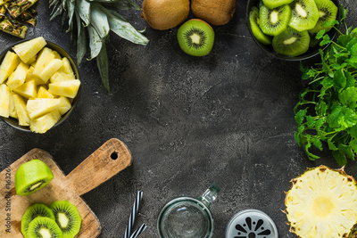 Fresh kiwi and pineapple as ingredients sliced for smoothie. Top view, copy space