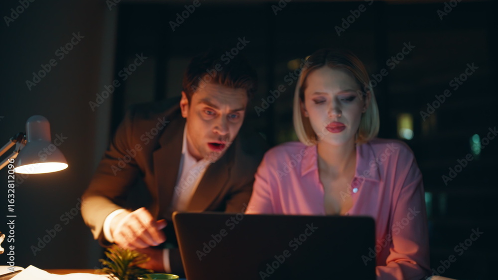 Stressed businesspeople frustrated fail working together at dark office closeup.