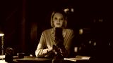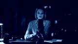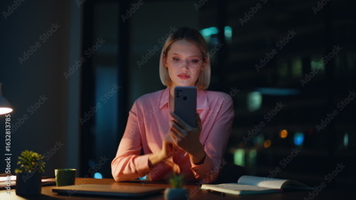 Smiling ceo looking smartphone at night office closeup. Businesswoman browsing