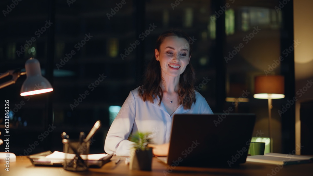 Businesswoman video calling night office closeup. Smiling woman virtual meeting