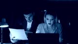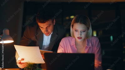 Two managers discussing documents late evening working with laptop closeup.