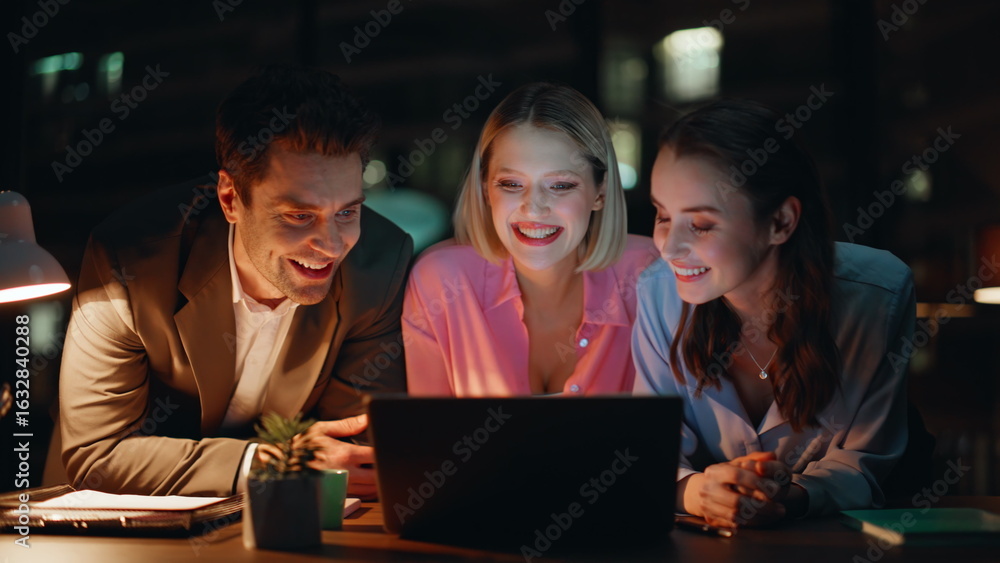 Cheerful team mates communicating at night workplace looking laptop closeup.