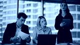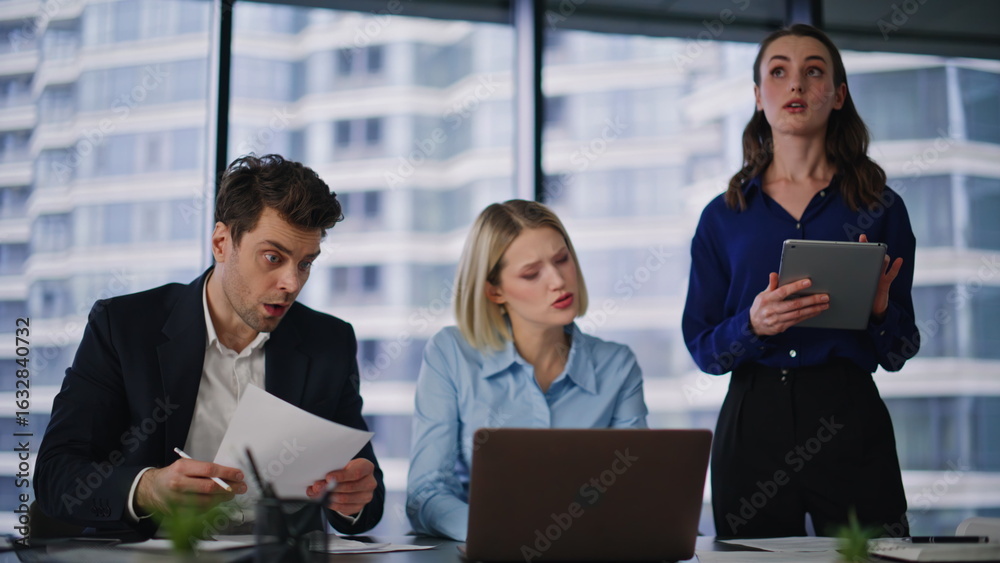Angry coworkers quarrelling virtual meeting dissatisfied report office closeup.