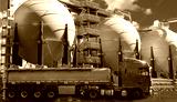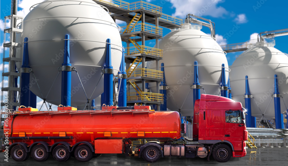 Red fuel tanker truck near spherical gas storage tanks at a refinery or chemical plant under blue sky, used in logistics, oil, gas, transportation, and energy industries.