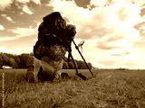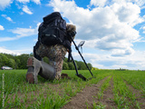 Man in camouflage with backpack kneeling in field, using metal detector to search soil under cloudy sky. Metal Detecting, Relic Hunting, Outdoor Activity, Travel, Archaeology.