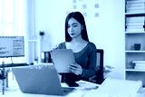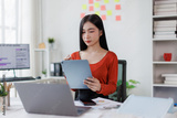 Asian Female business person using digital tablet and laptop or remote working at office, looking at digital tablet learning training, studying online thinking Financial and Accounting concept.