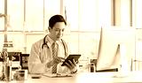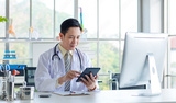 Asian male doctor in white coat with stethoscope, consulting digital tablet for health reading in modern hospital medical clinic office, research professional healthcare insurance wellness technology.