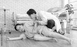 Asian doctor helps assistant offer urgent elderly female patient accident injury falling on ground in hospital floor, woman emergency healthcare with caregiver appears pain support healthcare medical.