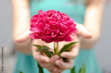 Flower in girl hand. Girl holding flower in hands in front of herself.