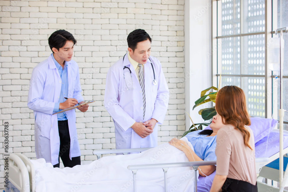 Asian man doctor and medical team visiting ward, consulting, talking to physician, senior woman patient lying on hospital bed room explaining medical treatment with family member showing care support.