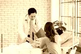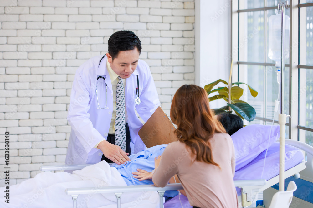 Asian man professional doctor visiting ward, consulting talking to physician, senior woman patient lying on hospital bed experiencing pain symptoms with her lovely daughter family showing care support