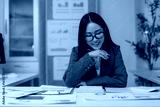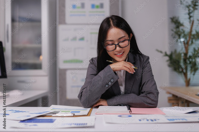 Asian businesswoman working with financial documents analyzing charts and graphs in office