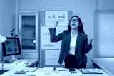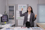Excited businesswoman celebrating success in modern office