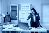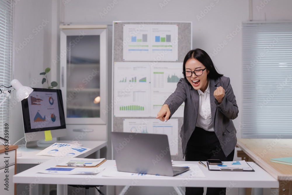 Excited businesswoman celebrating success while pointing at laptop in office